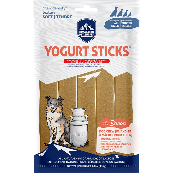 Himalayan Yogurt Sticks Bacon are a health and wellness treat for dogs. These health-conscious coconut & yogurt treats are loaded with prebiotics and probiotics that strengthen your pup's gut health and support building a balanced digestive system. They are made with the finest natural ingredients, no artificial flavors or preservatives, and are lactose, grain, corn, soy, and gluten-free. These treats are as nutritious as they are tasty